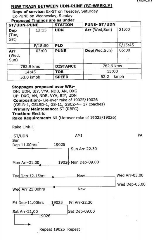 उपरोक्त पृष्ठ पर पश्चिम रेलवे की नई गाड़ी सूरत/उधना पुणे उधना/सूरत द्विसाप्ताहिक की बात की गई है। यह गाड़ी सूरत/उधना से प्रत्येक मंगलवार, शनिवार को दोपहर 12:15 को निकल नन्दूरबार, अमलनेर, जलगाँव, मनमाड़ दौंड होकर बुधवार, रविवार को प्रातः 3:00 बजे पुणे को पहुचेगी। वापसीमे बुधवार, रविवार को प्रातः 5:00 बजे पुणे से निकल उसी रात 21:00 बजे उधना/सूरत पहुचेंगी।