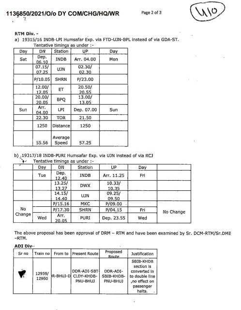 अगली गाड़ी है, इन्दौर पूरी इन्दौर साप्ताहिक हमसफर। इस गाड़ी को मक्सी के बजाय उज्जैन होकर ले जाया जा रहा है। बधाई हो उज्जैनवासियों, आपको पूरी धाम के लिए एक और गाड़ी मिल गयी है। कहीं यह वलसाड़ पूरी वलसाड़ की पुर्तता तो नही? शून्याधारित समयसारणी में वलसाड़ पूरी वलसाड़ गाड़ी का मार्ग परिवर्तन होने जा रहा है। यह गाड़ी वलसाड़ से इटारसी तक भुसावल होकर निकलने वाली है।