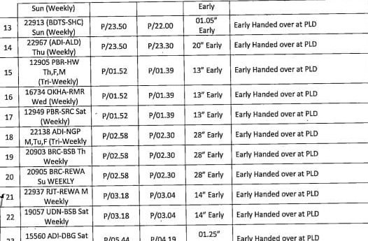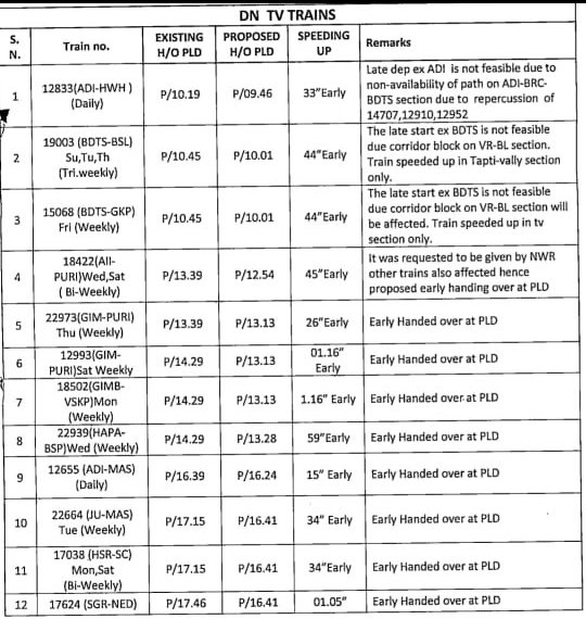 निम्नलिखित उधना जलगांव खण्ड पर चलनेवाली 23 गाड़ियाँ, जिनको स्पीड अप कर के मध्य रेल के जलगांव को हैंड ओवर किया जा रहा है। इसका मतलब यह है, की इन गाड़ियोंके समय मे बहुतेरे बदलाव होने है, बस इंतजार नियमित समयसारणी का है। गाड़ियोंके नाम के आगे परे के हँडींग ओवर स्टेशन पालधी का वर्तमान समय, प्रस्तावित समय, बचत किया गया समय और कारण इस तरह दिया गया है।