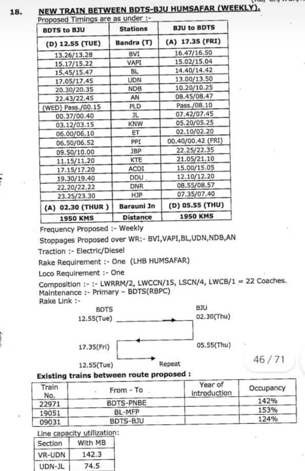 बान्द्रा टर्मिनस बरौनी बांद्रा टर्मिनस साप्ताहिक हमसफर विशेष बात, निम्नलिखित पत्रक में यह गाड़ी बताया गया है कि यह गाड़ी विरार उधना के बजाय उधना जलगांव होकर क्यों चल रही है। हमारी पिछले लेख में हमने उधना जलगांव मार्ग के निम्नतम उपयोग की बात कही थी। इस मार्ग का उपयोग केवल 74% ही किया जा रहा है। समयसारणी प्रस्तावित ही है, जब गाड़ियाँ पटरी पर आएगी तब और बदलाव हो सकते है।