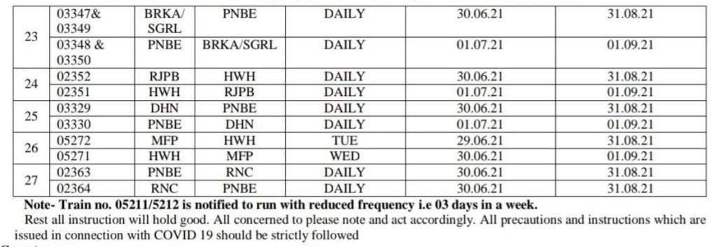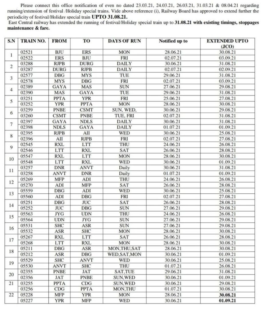पु म रेल ECR ने अपने क्षेत्र से 27 जोड़ी त्यौहार विशेष गाड़ियोंकी सीमित अवधि के लिए चलाने की घोषणा की है। यह गाड़ियाँ सम्पूर्ण आरक्षित एवं विशेष किराया श्रेणी, निर्बन्धित दूरी के साथ चलाई जाएगी। यात्रीगण इन गाड़ियोंके समयसारणी के लिए भारतीय रेल की वेबसाइट/ ऍप http://www.enquiry.indianrail.gov.in और आरक्षण के लिए http://www.irctc.co.in पर देख सकते है।