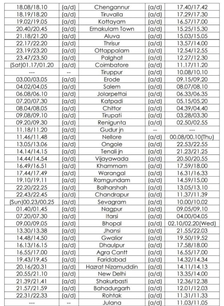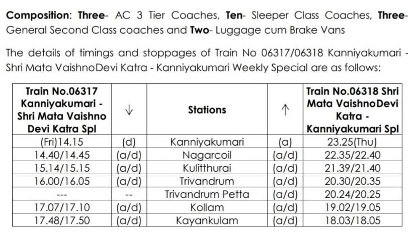 06317 कन्याकुमारी श्री माता वैष्णो देवी कटरा हिमसागर साप्ताहिक विशेष दिनांक 09 जुलाई से प्रत्येक शुक्रवार को चलेगी और वापसीमे 06318 श्री माता वैष्णो देवी कटरा कन्याकुमारी हिमसागर साप्ताहिक दिनांक 12 जुलाई से प्रत्येक सोमवार को चलेगी। समयसारणी निम्नलिखित प्रकार से है।