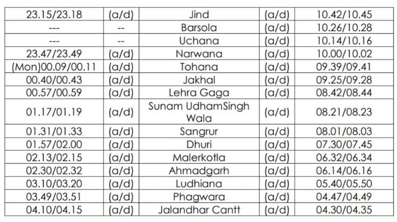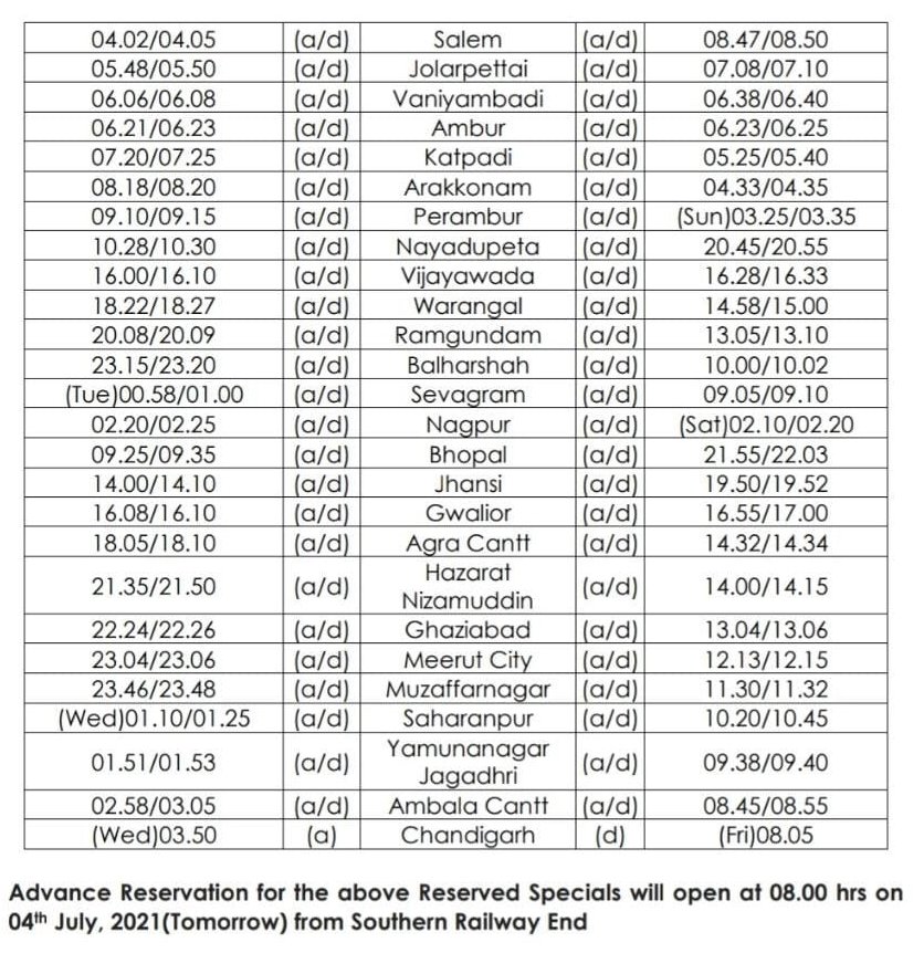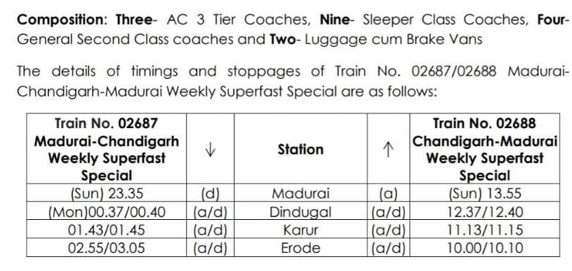 02687 मदुरई चंडीगढ़ साप्ताहिक विशेष दिनांक 11 जुलाई से प्रत्येक रविवार को चलेगी और वापसीमे 02688 चंडीगढ़ मदुरई साप्ताहिक विशेष दिनांक 16 जुलाई से प्रत्येक शुक्रवार को चला करेगी।
