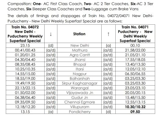 04072 नई दिल्ली पुड्डुचेरी साप्ताहिक विशेष दिनांक 11 जुलाई से प्रत्येक रविवार को चलेगी और वापसीमे 04071 पुड्डुचेरी नई दिल्ली साप्ताहिक विशेष दिनांक 14 जुलाई से प्रत्येक बुधवार को चलेगी।