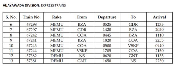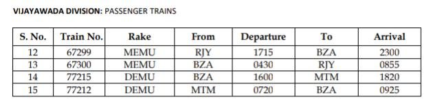 विजयवाड़ा मण्डल की 67299/300 राजमुंद्री विजयवाड़ा राजमुंद्री मेमू सवारी और 77215/16 विजयवाड़ा मच्चिलिपट्टनम विजयवाड़ा डेमू सवारी यथावत चलेगी।