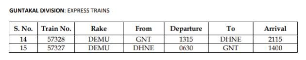 57327/28 ढोंण गुण्टूर ढोंण सवारी गाड़ी को डेमू एक्सप्रेस बनाकर चलाया जाएगा।