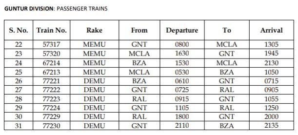 77221/22 विजयवाड़ा गुण्टूर/ गुण्टूर रेपाले सवारी डेमू बदले हुए समयोनुसार चलेगी।