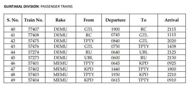 77407/08 गुंटकल रायचुर गुंटकल सवारी, 57475/76 तिरुपति गुंटकल तिरुपति सवारी, 57274/73 रायचुर हुब्बाल्ली रायचूर सवारी, 57401/02/03/04 तिरुपति काटपाडी तिरुपति दो जोड़ी सवारी गाड़ियाँ यह सारी डेमू रैक में तब्दील की जाएगी।
