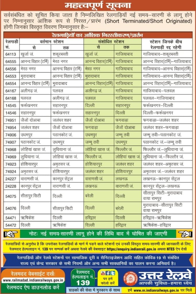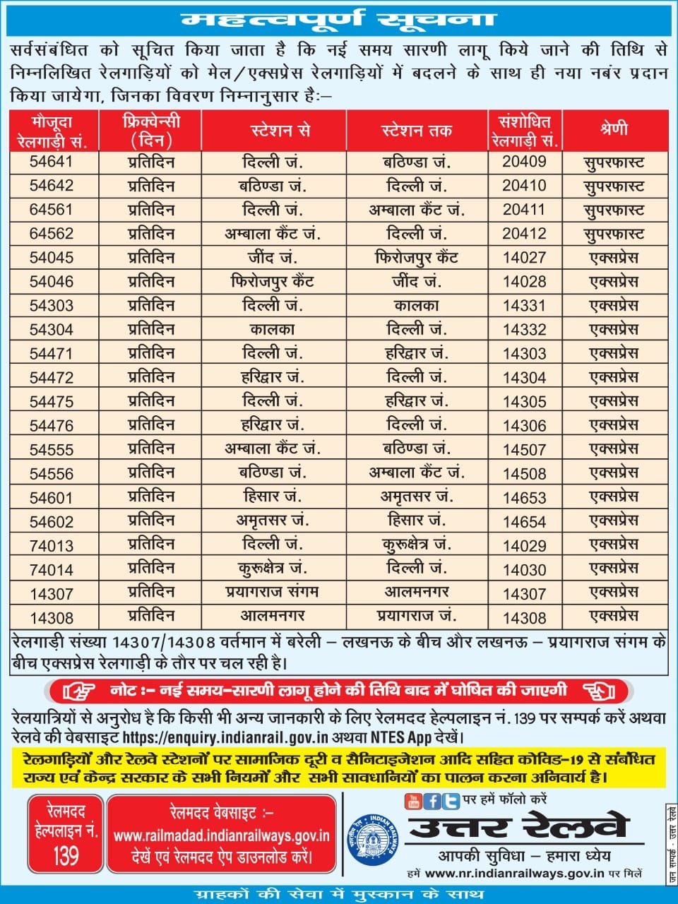 उत्तर रेलवे ने आज परीपत्रक जारी किए है जिसमे यह कहा गया है, जब भी समयसारणी नियमित होंगी तब उनकी गाड़ियोंके क्रमांक और परिचालन स्थितियां बदली जाएगी। परीपत्रक देखते हुए सम्भवतः यह लगता है, की नियमित समयसारणी जारी किए जाने में अब ज्यादा दिन नही लगेंगे। नियमित समयसारणी के कारण यात्रिओंके रेल यात्रा नियोजन में स्थिरता आ सकेगी और बार बार रेलवे के परीपत्रक पर नजर रखने की परेशानी से छुटकारा मिल सकेगा। आइए परीपत्रक भी देख लेते है।