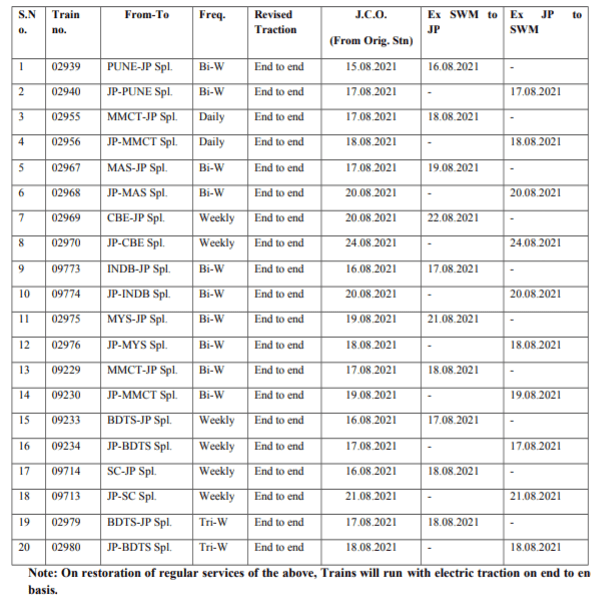 उत्तर पश्चिम रेल प्रशासन ने यह घोषणा की है, सवाई माधोपुर – जयपुर रेल खण्ड पुर्णतयः इलेक्ट्रीफाइड किया जा चुका है। इस मार्ग पर चलनेवाली सभी रेल गाड़ियाँ और 10 जोड़ी यात्री गाड़ियाँ एन्ड टू एन्ड याने अपने शुरवाती स्टेशन से लेकर गन्तव्य तक सीधे इलेक्ट्रिक लोको के चलाई जाएगी। गौरतलब यह है, इसमें न सिर्फ महंगे तेल का खर्च बचेगा बल्कि लोको बदलने से स्टाफ़ और गाड़ियोंके समय की भी बचत होगी। भारतीय रेल के सम्पूर्ण विद्युतीकरण कार्यक्रम का यह विद्युतीकरण एक हिस्सा है।