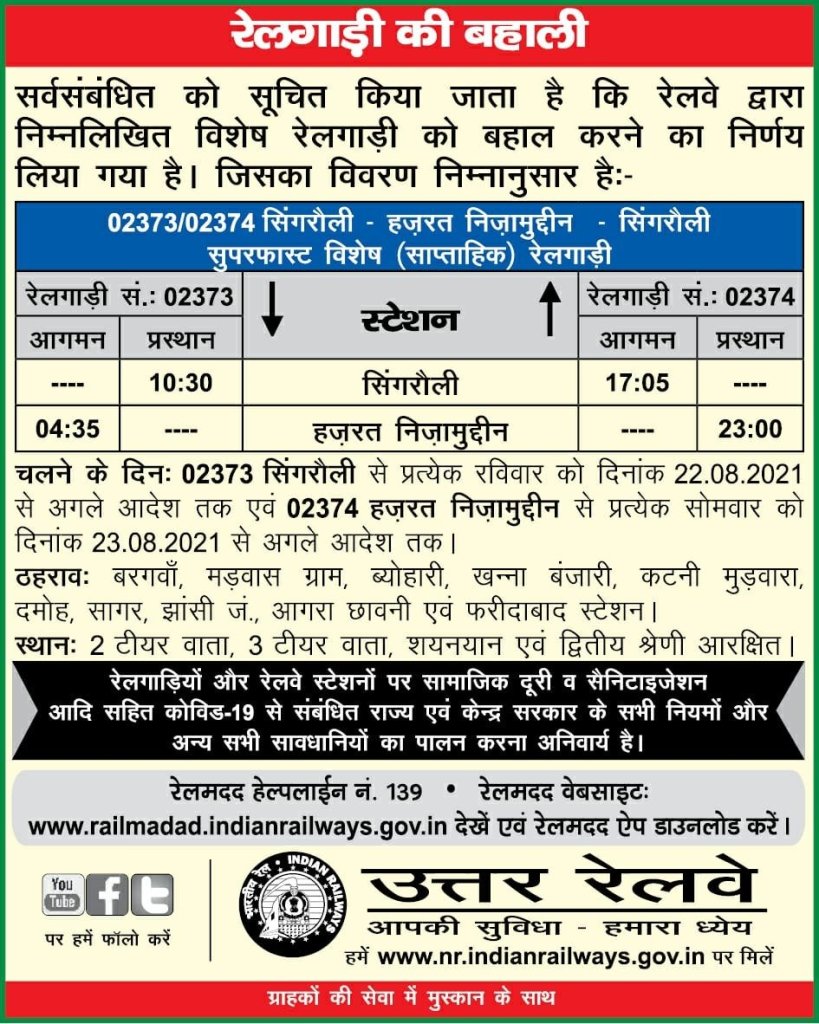 22167/68 सिंगरौली हज़रत निजामुद्दीन सिंगरौली साप्ताहिक एक्सप्रेस को 02373/74 इस विशेष क्रमांक से चलाया जाएगा। 02373 सिंगरौली हज़रत निजामुद्दीन साप्ताहिक विशेष दिनांक 22 अगस्त से प्रत्येक रविवार को चलेगी और वापसीमे 02374 हज़रत निजामुद्दीन सिंगरौली साप्ताहिक विशेष दिनांक 23 अगस्त से प्रत्येक सोमवार को चलेगी।
