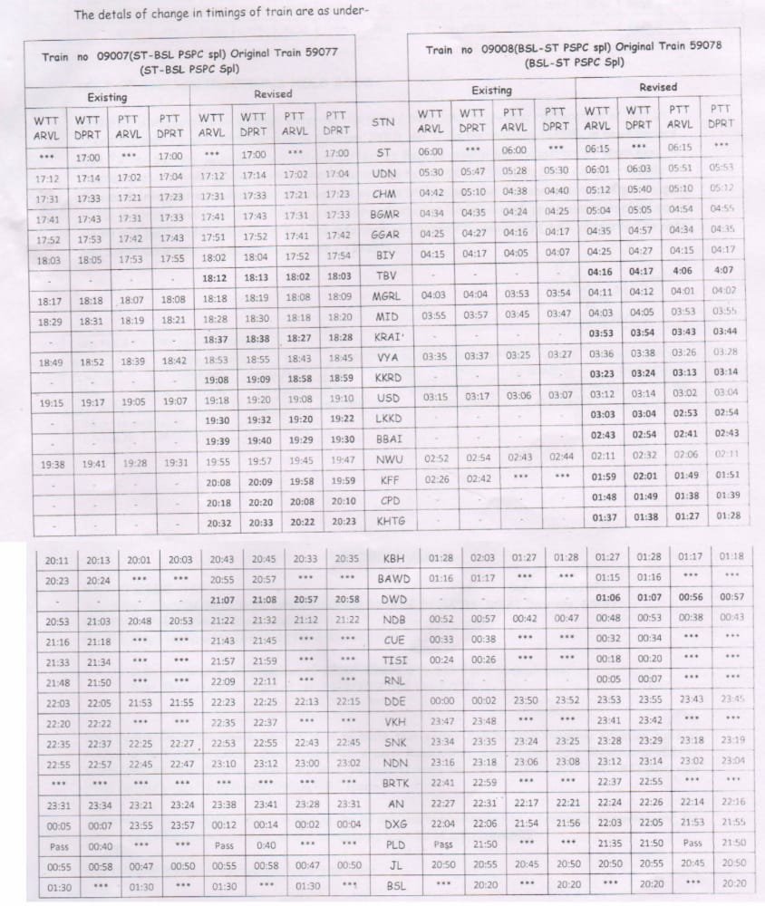 09007/08 सूरत भुसावल सूरत विशेष गाड़ी के समयसारणी में बदलाव किया जा रहा है। यह गाड़ी अब टिम्बरवा, काहेर, चिंचपाड़ा, किकाकुई रोड, लक्कड़कोट, भड़भूँजा, कोलड, खातगाव, ढेकवद इन स्टेशनोंपर दोनोंही दिशाओं में ठहराव लेगी। इस के चलते गाड़ी के समयसारणी में जो बदलाव हुवा है, वह निम्नलिखित परीपत्रक में दिया गया है।