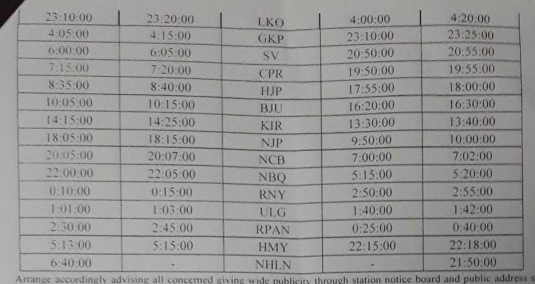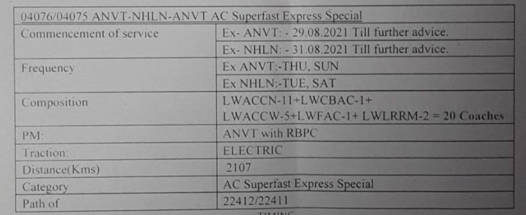 04076 आनंदविहार नाहरलगुन द्विसाप्ताहिक विशेष दिनांक 29 अगस्त से प्रत्येक गुरुवार एवं रविवार को चलेगी और वापसीमे 04075 नाहरलगुन आनंदविहार द्विसाप्ताहिक विशेष दिनांक 31 अगस्त से प्रत्येक मंगलवार एवं शनिवार को चलेगी।