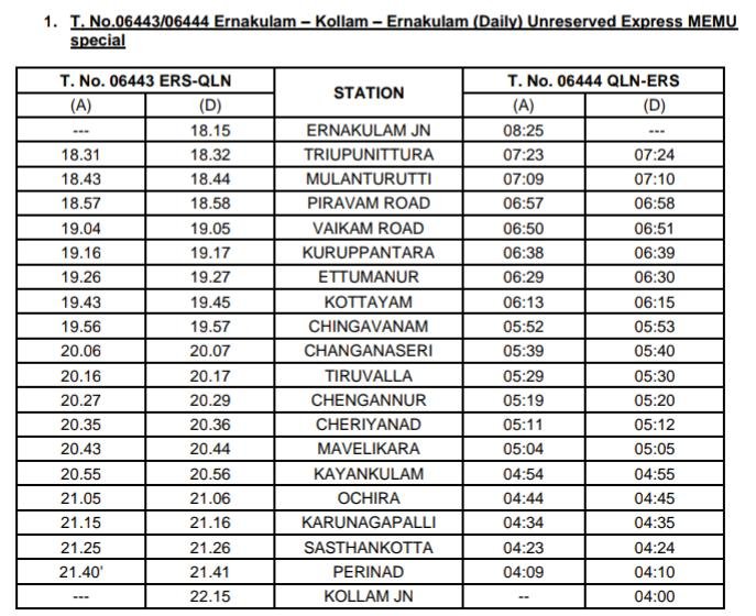 1: 06443/44 एर्नाकुलम कोलम एर्नाकुलम प्रतिदिन अनारक्षित मेमू