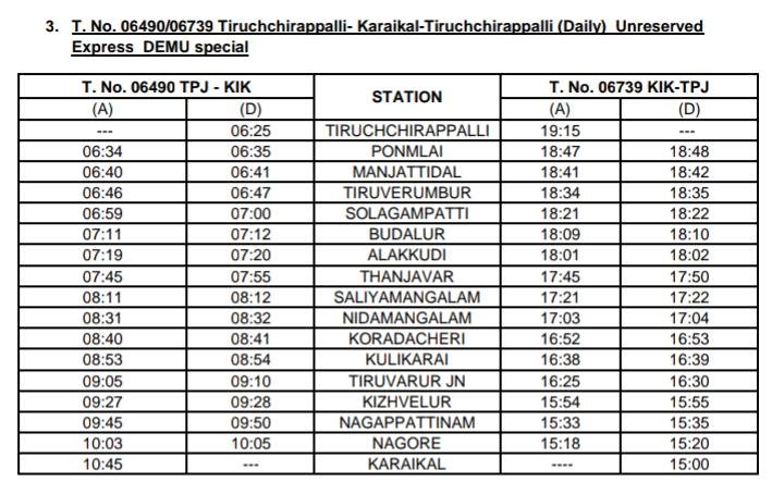 06490 तिरुचिरापल्ली कराईकल प्रतिदिन डेमू और वापसीमे 06739 कराईकल तिरुचिरापल्ली प्रतिदिन डेमू