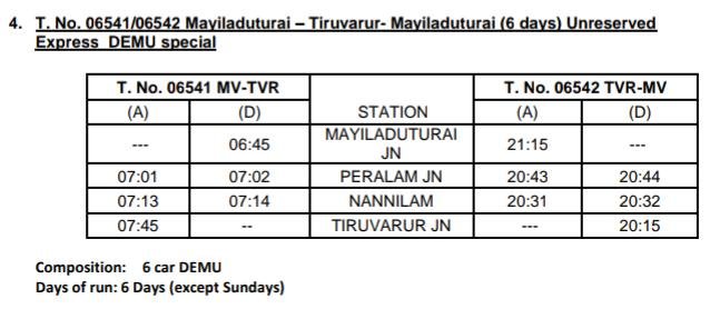 06541/42 माइलादुत्तराई तिरुवरूर माइलादुत्तराई डेमू, सप्ताह में 6 दिन प्रत्येक रविवार को छोड़कर चलाई जाएगी।