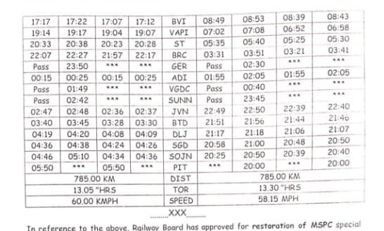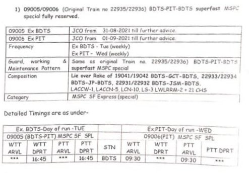 09005/06 बान्द्रा टर्मिनस पालिताना बान्द्रा टर्मिनस साप्ताहिक विशेष दिनांक 31 अगस्त से प्रत्येक मंगलवार को बान्द्रा टर्मिनस से और 01 सितम्बर से प्रत्येक बुधवार को पालिताना से चलेगी। निम्नलिखित तीनों जोड़ी गाड़ियाँ सम्पूर्ण आरक्षित रहेंगी।