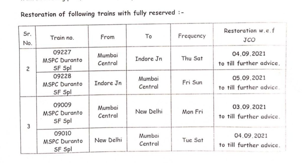 09227/28 मुम्बई सेंट्रल इन्दौर मुम्बई सेंट्रल द्विसाप्ताहिक दुरान्तो विशेष दिनांक 04 सितम्बर से प्रत्येक गुरुवार एवं शनिवार को मुम्बई सेंट्रल से और 05 सितम्बर से प्रत्येक शुक्रवार एवं रविवार को इन्दौर से चलेगी।