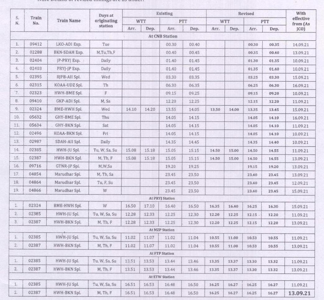 निम्नलिखित परीपत्रक में कानपुर सेंट्रल स्टेशन पर 19 गाड़ियोंके, प्रयागराज जंक्शन पर 3 गाड़ियोंके, मिर्जापुर स्टेशन पर 2 गाड़ियोंके, फतेहपुर स्टेशन पर 2 गाड़ियोंके और इटावा स्टेशनकी 2 गाड़ियोंके समय बदलाव की जानकारी है। यात्रीगण कृपया समय बदलाव की तिथि पर ध्यान दीजिएगा। PTT यानी पब्लिक टाइमटेबल वाले कॉलम के समय यात्रिओंके लिए निर्धारित किए जाते है। WTT यानी वर्किंग टाइमटेबल यह समय रेलवे के परिचालन के उपयोग हेतु है, इनका यात्रिओंके समयसारणी से कोई लेनादेना नही है।