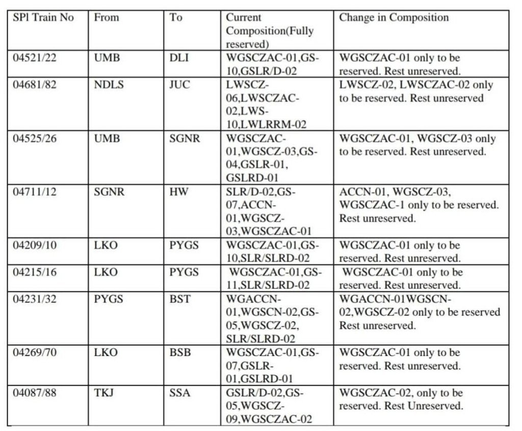उत्तर रेलवे हाल ही में अपने पांचों मण्डल की बहुतांश अनारक्षित डेमू/मेमू गाड़ियोंमें MST धारकोंको रेल यात्रा की अनुमति दे दी थी और अब 8 जोड़ी प्रतिदिन एवं 1 जोड़ी सप्ताह में 5 दिनोंके लिए चलनेवाली मेल / एक्सप्रेस विशेष गाड़ियोंके द्वितीय श्रेणी कोच अनारक्षित यात्रिओंके लिए दिनांक 10 सितम्बर से खोले जा रहे है। इसका अर्थ यह है, की यात्री बिना आरक्षण लिए, काउंटर या यु टी एस से अनारक्षित टिकट खरीद कर अपनी यात्रा तुरन्त प्रारम्भ कर सकता है। आइए समझते है, सूची में कौनसी गाड़ियोंके डिब्बे अनारक्षित किए जा रहे है।