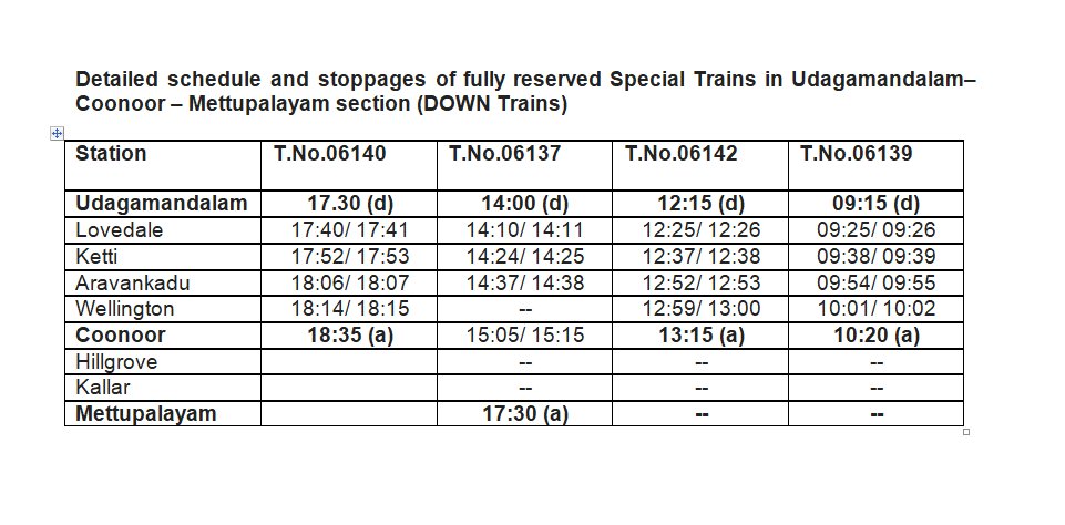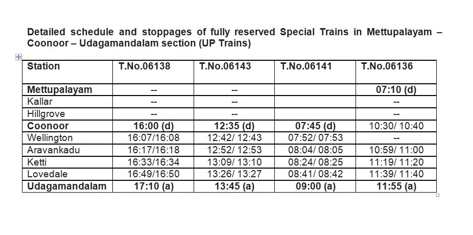 NMR नीलगिरी माउंटन रेल की 3 जोड़ी गाड़ियाँ कुन्नूर से उदगमण्डलम के बीच एवं एक जोड़ी सेवा मेट्टूपालायम से उदगमण्डलम के बीच शुरू की जा रही है। समयसारणी के लिए निम्नलिखित पत्रक देखें।