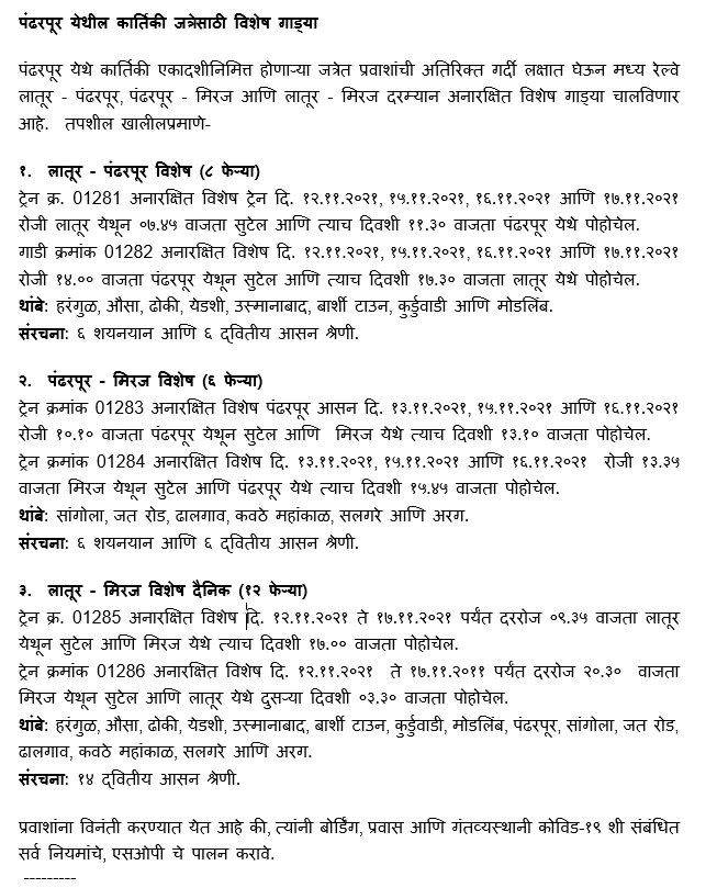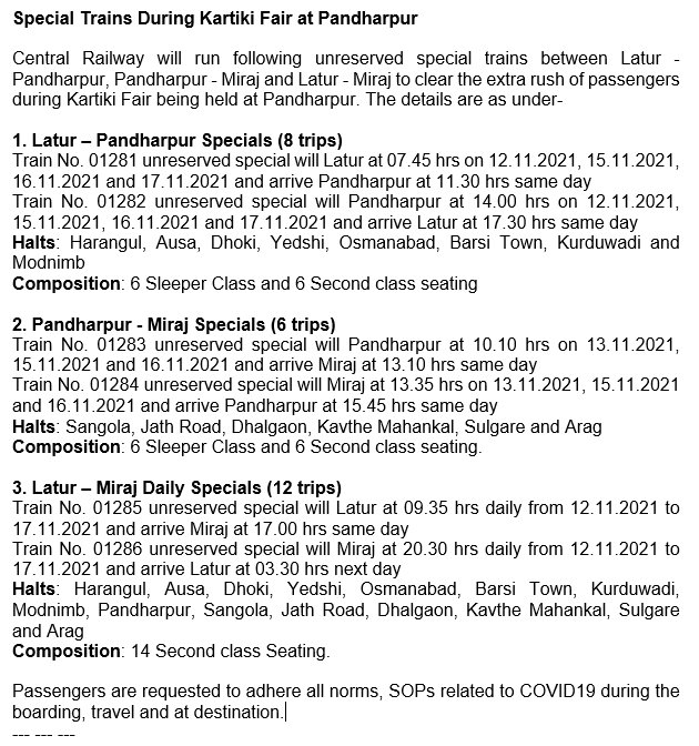 देव उठनी ग्यारस अर्थात कार्तिकी एकादशी निमित्त मध्य रेलवे ने तीर्थक्षेत्र पंढरपुर के लिए विशेष गाड़ियोंका नियोजन किया है।