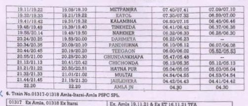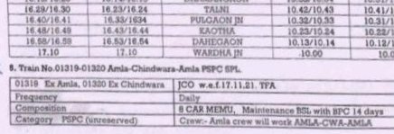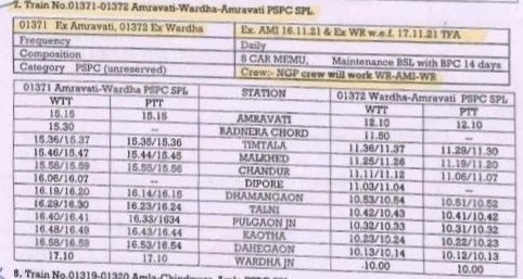 7: 01371 अमरावती वर्धा अनारक्षित प्रतिदिन मेमू दिनांक 16 नवम्बर से चलना शुरू करेगी। 01372 वर्धा अमरावती अनारक्षित प्रतिदिन मेमू दिनांक 17 नवम्बर से चलना शुरू करेगी।