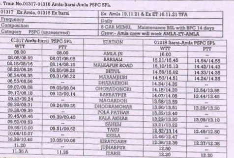 6: 01318 इटारसी आमला अनारक्षित प्रतिदिन मेमू दिनांक 16 नवम्बर से चलना शुरू करेगी। 01317 आमला इटारसी अनारक्षित प्रतिदिन मेमू दिनांक 19 नवम्बर से चलना शुरू करेगी।