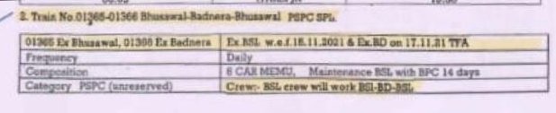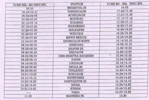 2: 01365 भुसावल बड़नेरा अनारक्षित प्रतिदिन मेमू दिनांक 15 नवम्बर से और 01366 बड़नेरा भुसावल अनारक्षित प्रतिदिन मेमू दिनांक 17 नवम्बर से चल पड़ेगी।