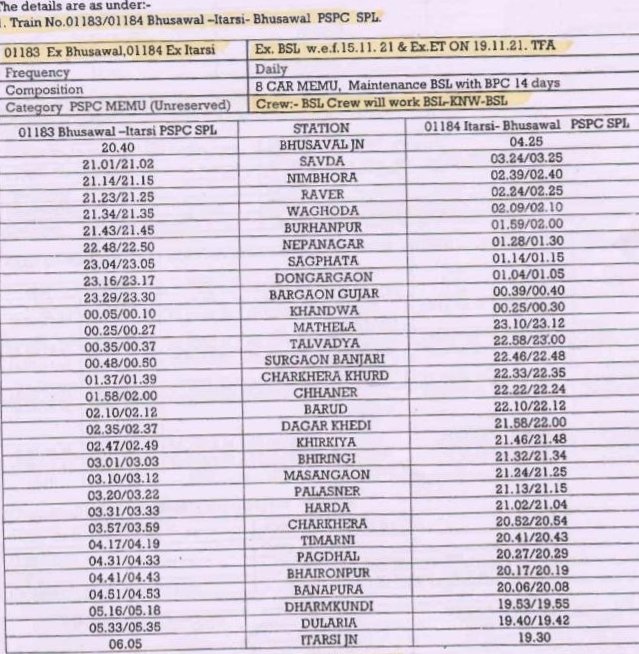 1: 01183 भुसावल इटारसी अनारक्षित प्रतिदिन मेमू दिनांक 15 नवम्बर से और 01184 इटारसी भुसावल अनारक्षित प्रतिदिन मेमू दिनांक 19 नवम्बर से चलना शुरू करेगी।