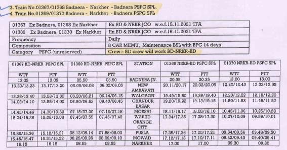 3, 4: 01367/01368 बड़नेरा नरखेड बड़नेरा अनारक्षित प्रतिदिन मेमू दिनांक 15 नवम्बर से और 01369/01370 बड़नेरा नरखेड बड़नेरा अनारक्षित प्रतिदिन मेमू दिनांक 16 नवम्बर से चलना शुरू करेगी।