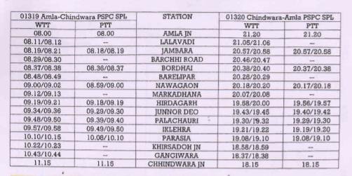 8: 01319/20 आमला छिंदवाड़ा आमला अनारक्षित प्रतिदिन मेमू दिनांक 17 नवम्बर से चलना शुरू करेगी।
