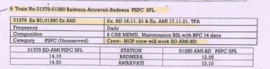 9: 01379 बड़नेरा अमरावती अनारक्षित प्रतिदिन मेमू दिनांक 16 नवम्बर से चलना शुरू करेगी। 01380 अमरावती बड़नेरा अनारक्षित प्रतिदिन मेमू दिनांक 17 नवम्बर से चलना शुरू करेगी।