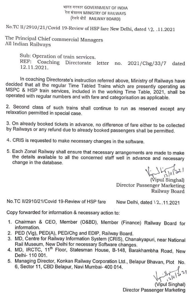 यज्ञपी उपरोक्त पत्र में गाड़ियोंके नियमितीकरण की कोई विशिष्ट तिथि की घोषणा नही है परंतु जब भी यह बात लागू हो जाएगी, रेल प्रशासन अब तक आबंटित टिकटोंका कोई भी फ़र्क, डिफरेंस न तो वसूल करेगी और ना ही अदा करेगी।
