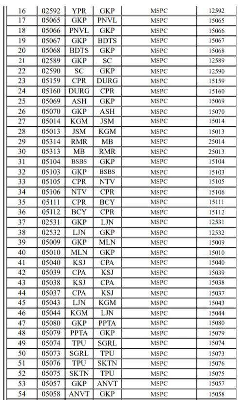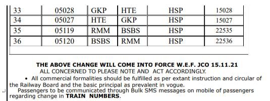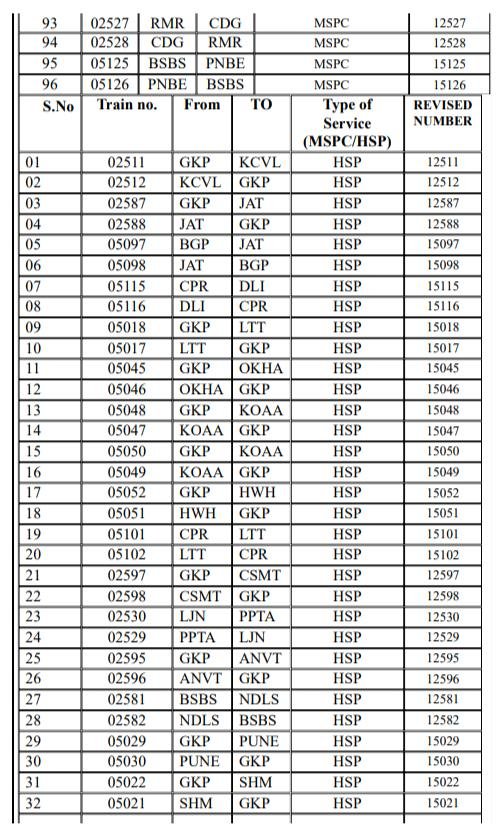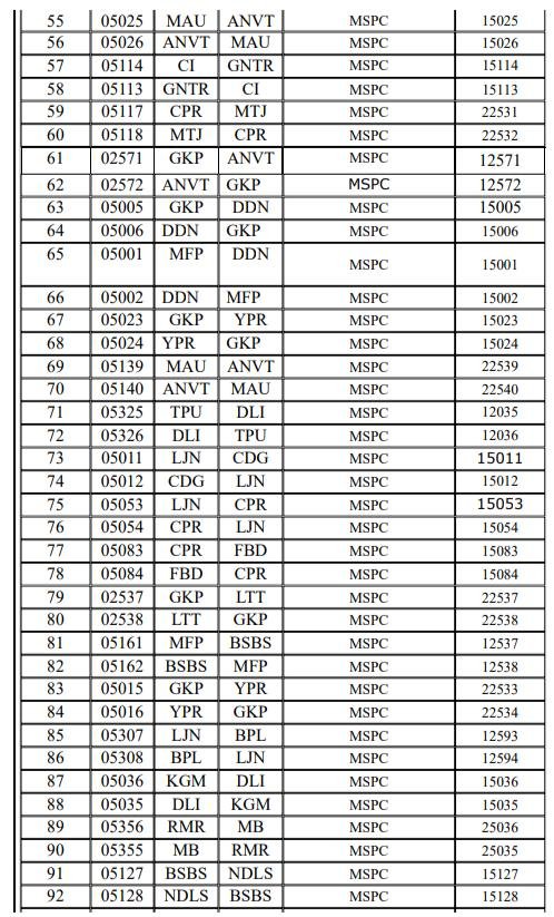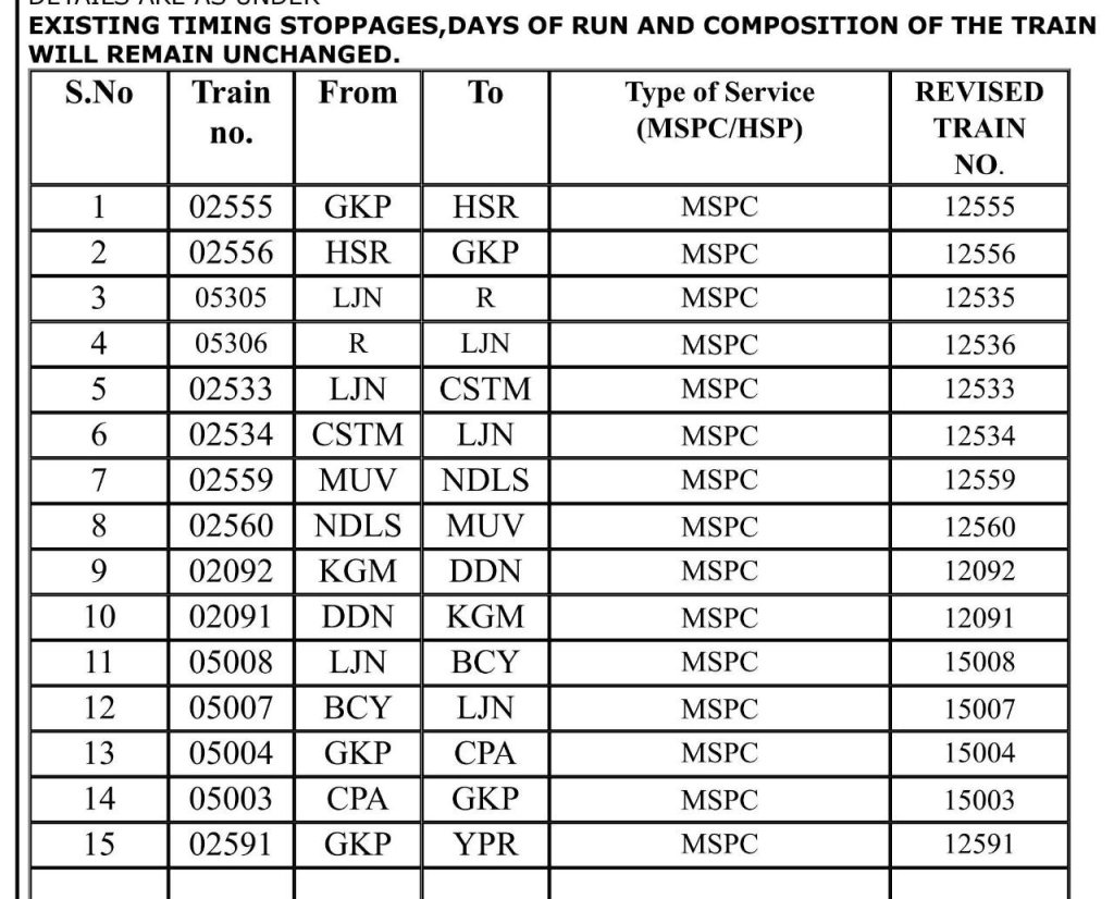 पूर्वोत्तर रेलवे में दिनांक 15 नवम्बर से 96 MSPC मेल/एक्सप्रेस विशेष और 56 HSP त्यौहार विशेष गाड़ियोंका नियमितीकरण किया जा रहा है। उपरोक्त गाड़ियोंके क्रमांक बदले जाएंगे साथ ही किराया श्रेणी भी नियमित की जाएगी।