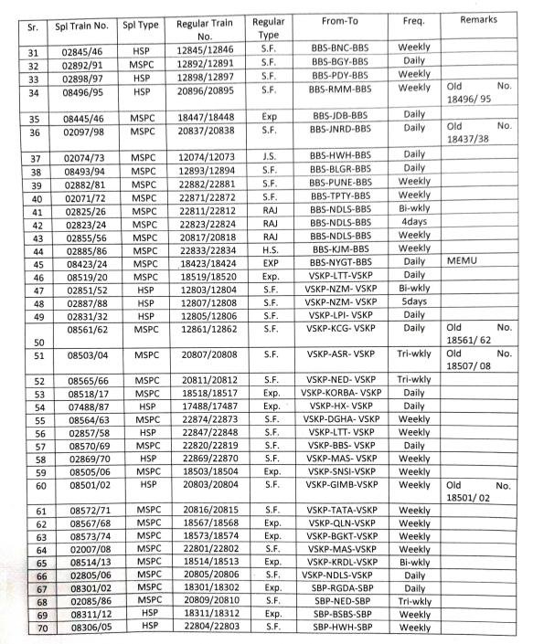 पूर्व तटीय रेलवे में दिनांक 15 नवम्बर से 76 जोड़ी MSPC मेल/एक्सप्रेस विशेष और HSP त्यौहार विशेष गाड़ियोंका नियमितीकरण किया जा रहा है। उपरोक्त गाड़ियोंके क्रमांक बदले जाएंगे साथ ही किराया श्रेणी भी नियमित की जाएगी।