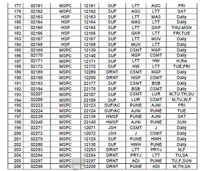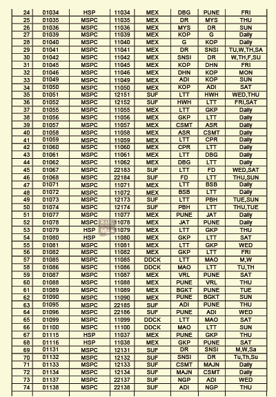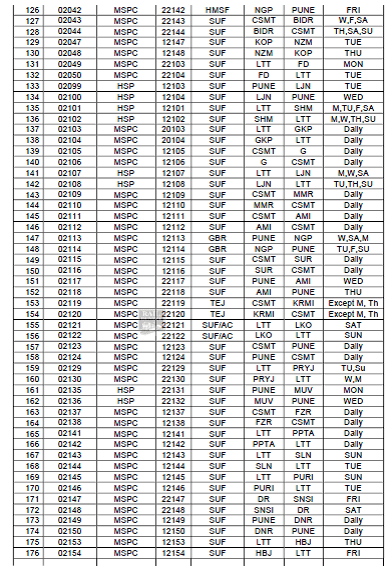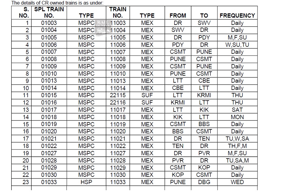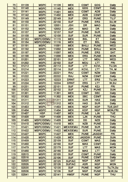 भारतीय रेल की फिलहाल चल रही सभी विशेष और त्यौहार विशेष गाड़ियाँ अपने नियमित गाड़ी क्रमांक एवं नियमित किराया सूची के अनुसार चलने लगेंगी। मध्य रेलवे की निम्नलिखित गाड़ी क्रमांक और नियमित किरायोंके बदलाव, अपने स्टार्टिंग स्टेशन से दिनांक 15 नवम्बर से छूटने वाली गाड़ियोंसे लागू कर दिए जाएंगे। (JCO – 15/11/2021)