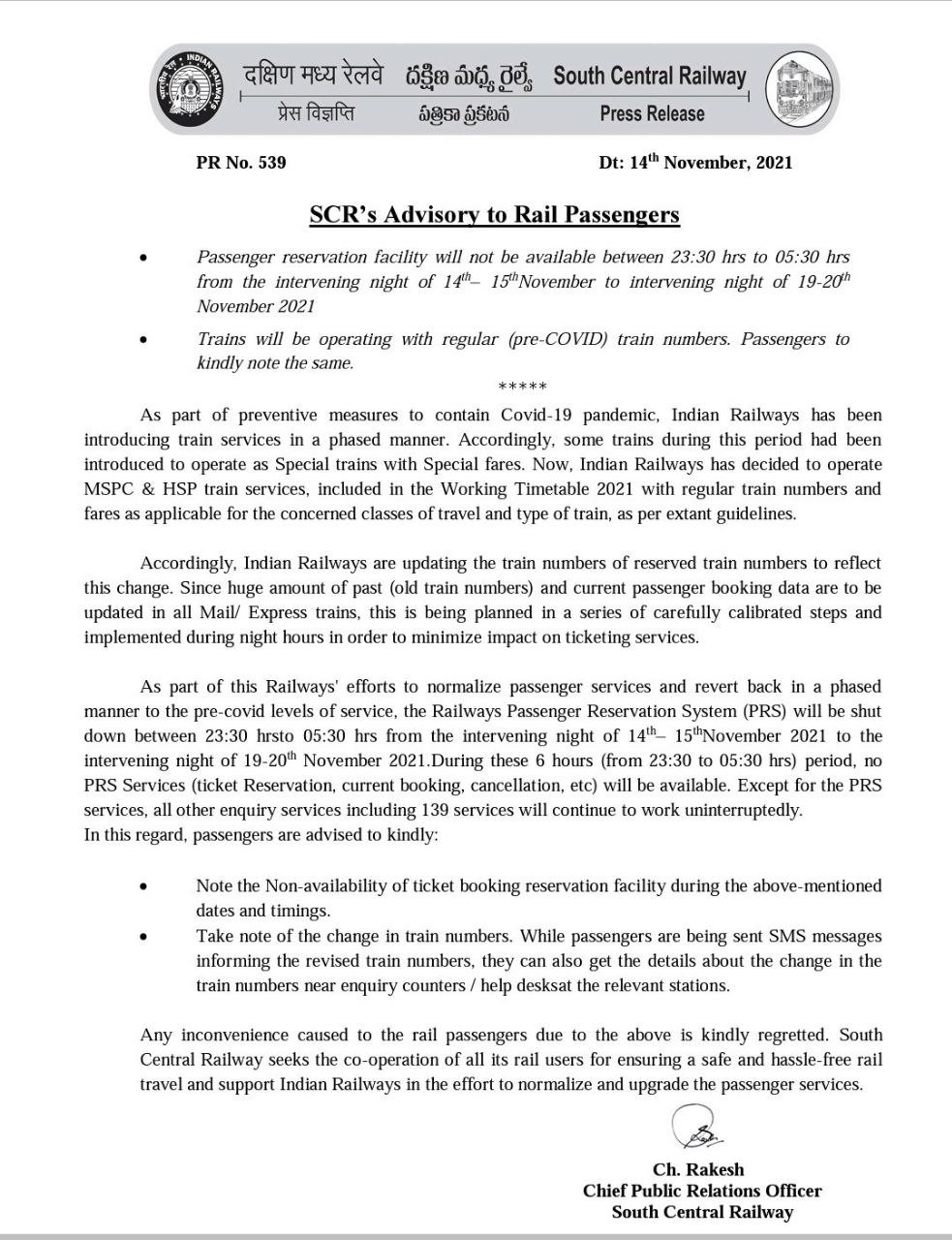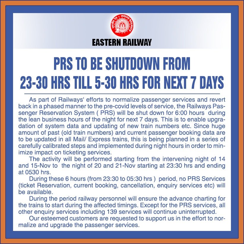 यज्ञपी अपडेटेशन के लिए चुना गया समय एकदम खाली अवधि वाला है, यात्री मांग बहुत कम रहती है, फिर भी रेल प्रशासन यात्रिओंसे निवेदन करती है, उपरोक्त बन्द समय का ध्यान रखते हुए यात्री अपने टिकट सम्बन्धी कार्य का नियोजन करें। रेलवे की हेल्पलाइन 139 यथावत शुरू रहेंगी।