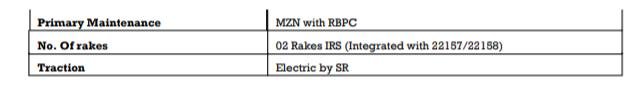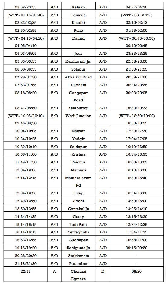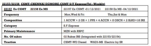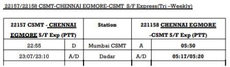 1: 11027/28 दादर चेन्नई एग्मोर के बीच प्रतिदिन चलनेवाली चेन्नई मेल सुपरफास्ट स्वरुप और त्रिसाप्ताहिक स्वरुप में बहाल होने जा रही है। इस बदले रूप में इसका गाड़ी क्रमांक 22157/58 और टर्मिनल बदलाव होकर, छत्रपति शिवाजी महाराज टर्मिनस से चेन्नई एग्मोर के बीच चलाई जाएगी। 22157 दिनांक 01 दिसम्बर से प्रत्येक सोमवार, बुधवार एवं शुक्रवार को छत्रपति शिवाजी महाराज टर्मिनस मुम्बई से चलेगी और वापसीमे 22158 दिनांक 04 दिसम्बर से प्रत्येक गुरुवार, शनिवार एवं सोमवार को चलाई जाएगी। यात्रीगण कृपया बदले हुए टर्मिनल, परिचालन दिन एवं समयसारणी पर ध्यान दीजिएगा।