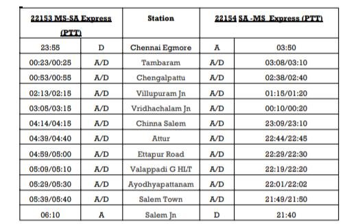 2: 11063/64 चेन्नई एग्मोर सालेम के बीच प्रतिदिन चलनेवाली एक्सप्रेस अब सुपरफास्ट स्वरुप और त्रिसाप्ताहिक स्वरुप में बहाल होने जा रही है। इसका गाड़ी क्रमांक 22153/54 रहेगा। 22153 दिनांक 02 दिसम्बर से प्रत्येक मंगलवार, गुरुवार एवं शनिवार को चेन्नई एग्मोर से रवाना होगी। वापसीमे 22154 दिनांक 03 दिसम्बर से प्रत्येक बुधवार, शुक्रवार एवं रविवार को सालेम से चलाई जाएगी। यात्रीगण कृपया बदले हुए परिचालन दिन एवं समयसारणी पर ध्यान दीजिएगा।