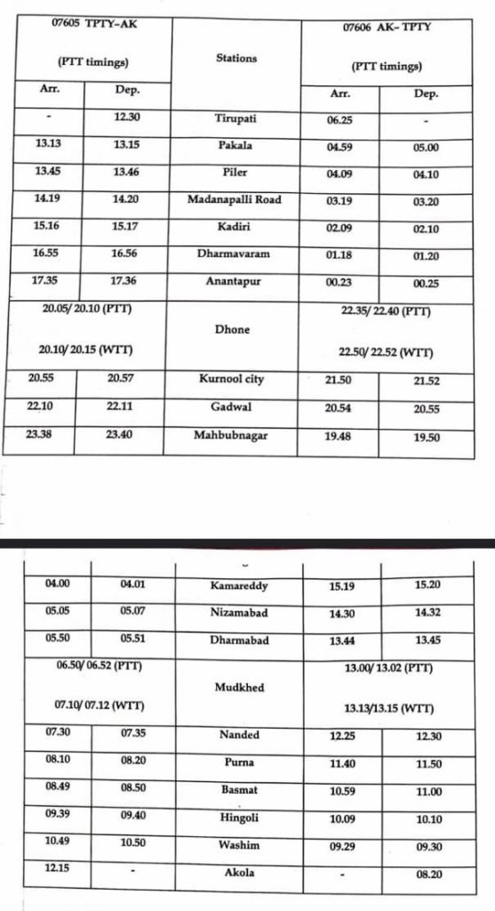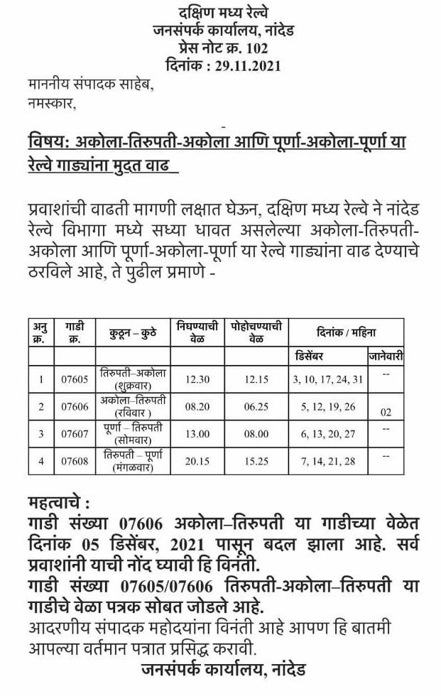 निम्नलिखित परिपत्रक देखिए, अकोला और पुर्णा से तिरुपति के लिए साप्ताहिक विशेष चलाई जा रही है। अब इनके फेरों में विस्तार किया जा रहा है। हम द म रेल का अभिनन्दन करते है की उन्होंने अपने क्षेत्र में लोकप्रिय रेल मार्ग पर यात्रिओंके लिए सुविधाएं प्रदान की। इसी तरह हैदराबाद बीकानेर विशेष भी मार्ग के अनछुए स्टेशनोंसे गुजरते हुए चलाई है।