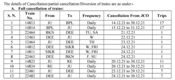 9: 22481 जोधपुर दिल्ली सराय रोहिल्ला प्रतिदिन सुपरफास्ट दिनांक 23 दिसंबर से 29 दिसंबर तक और 22482 दिल्ली सराय रोहिल्ला जोधपुर प्रतिदिन सुपरफास्ट दिनांक 24 दिसंबर से 30 दिसंबर तक नहीं चलेगी।