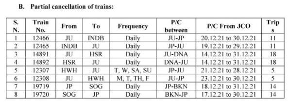 8: 14823/24 जोधपुर रेवाड़ी जोधपुर प्रतिदिन दोनोंही दिशाओं से दिनांक 20 से लेकर 30 दिसम्बर तक नही चलेगी।