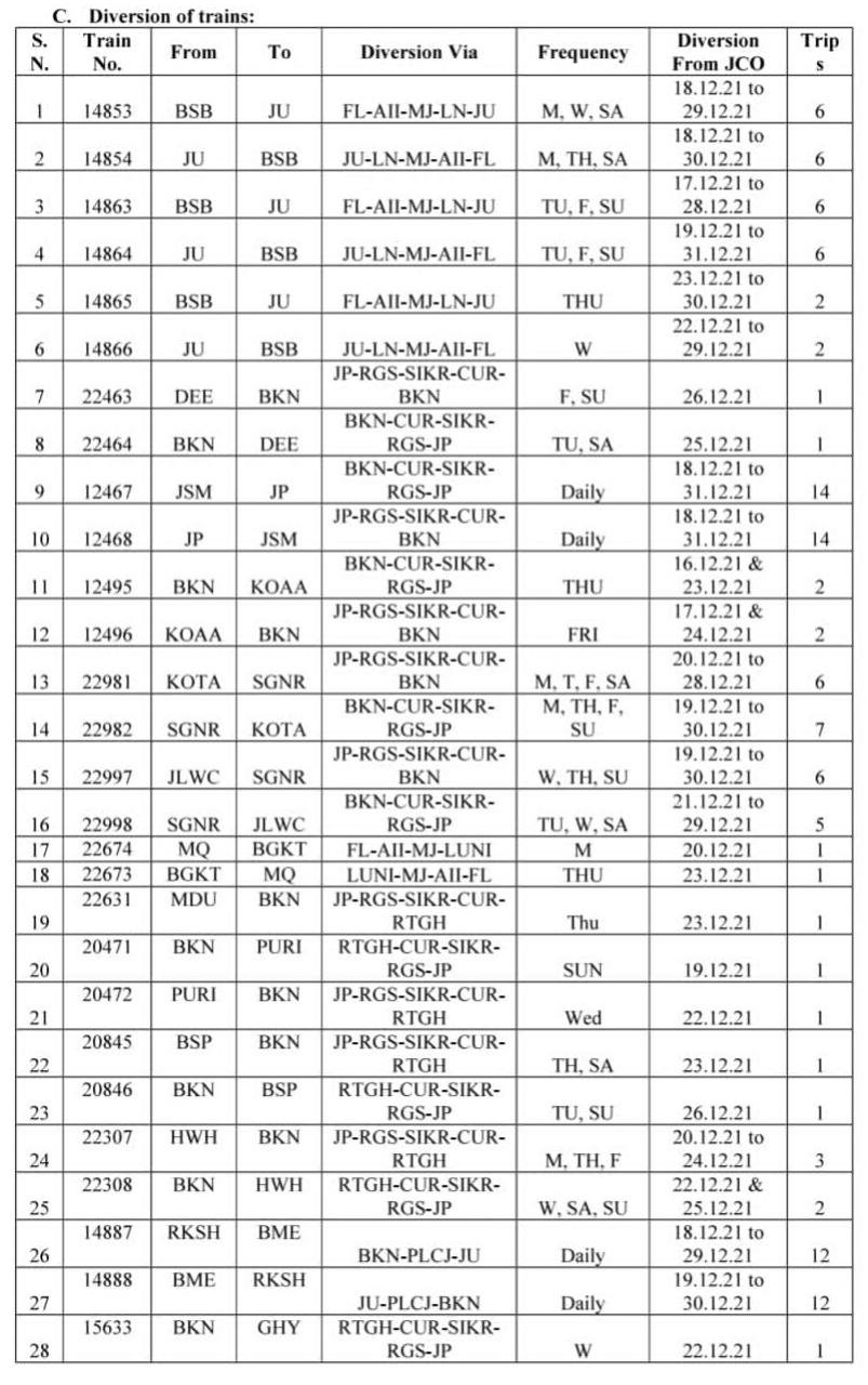 22981/82 कोटा श्रीगंगानगर कोटा सप्ताह मे 4 दिन चलनेवाली सुपरफास्ट 19 से 30 दिसंबर के बीच जयपुर – रिंगस – सीकर – चुरू- बीकानेर जाएगी और बीकानेर से अपने नियोजित मार्ग से श्री गंगानगर जायगी।