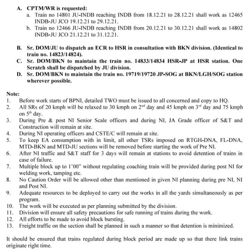 यात्रीगण से निवेदन है, उपरोक्त रेल मार्गपर यात्रा का नियोजन रेलवे हेल्पलाइन 139 या रेल विभाग की वेबसाइट से जानकारी लेकर ही करें। परिपत्रक मे दी गई सभी तिथियाँ JCO अर्थात गाड़ी के प्रारम्भिक स्टेशन की तिथियाँ है।