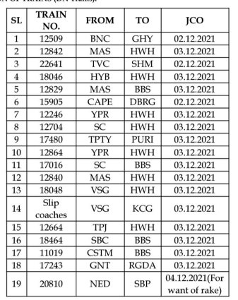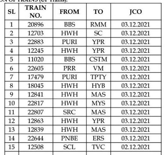 डाउन दिशा में दिनांक 02, 03 एवं 04 दिसम्बर को अपने प्रारम्भिक स्टेशन चलने वाली 19 गाड़ियाँ पूर्णतयः रद्द की गई है।