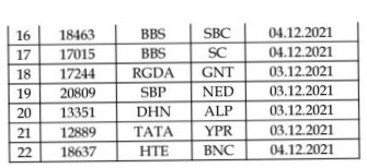 अप दिशा में दिनांक 03/04 दिसम्बर को अपने प्रारम्भिक स्टेशन चलने वाली 22 गाड़ियाँ पूर्णतयः रद्द की गई है।