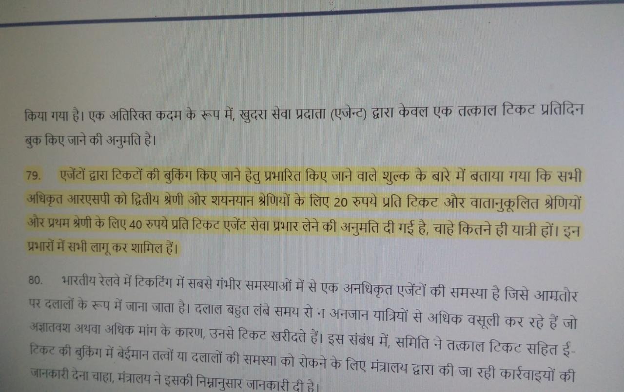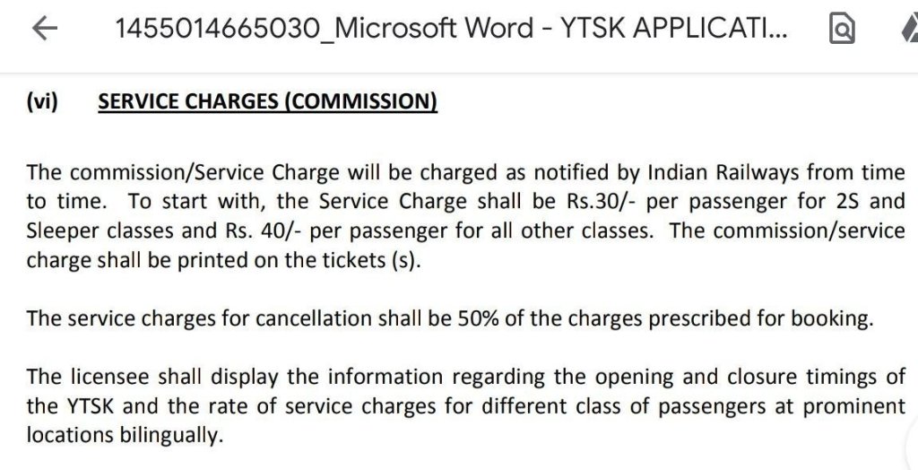 यात्रिओंको सिर्फ टिकटोंकी नही बल्कि कन्फर्म टिकटोंकी उपलब्धि चाहिए है। रेल प्रशासन PRS के अलावा डाकघर, IRCTC की वेबसाइट और ऍप, YTSK काउंटर्स पर आरक्षित टिकट उपलब्ध कराती है। YTSK काउंटर के सर्विस चार्ज का भी एक अलग गणित है। रेलवे समिति को कुछ और ही बता रही है और हकीकत में वसूली कुछ अलग ही हो रही है। YTSK यात्री टिकट के बारे में समिती को यह दर्शाया गया है की पर टिकट शुल्क लिया जाता है न की प्रति यात्री, जब की ऐसा नही है। निम्नलिखित YTSK टिकट और नियमावली देखी जा सकती है।