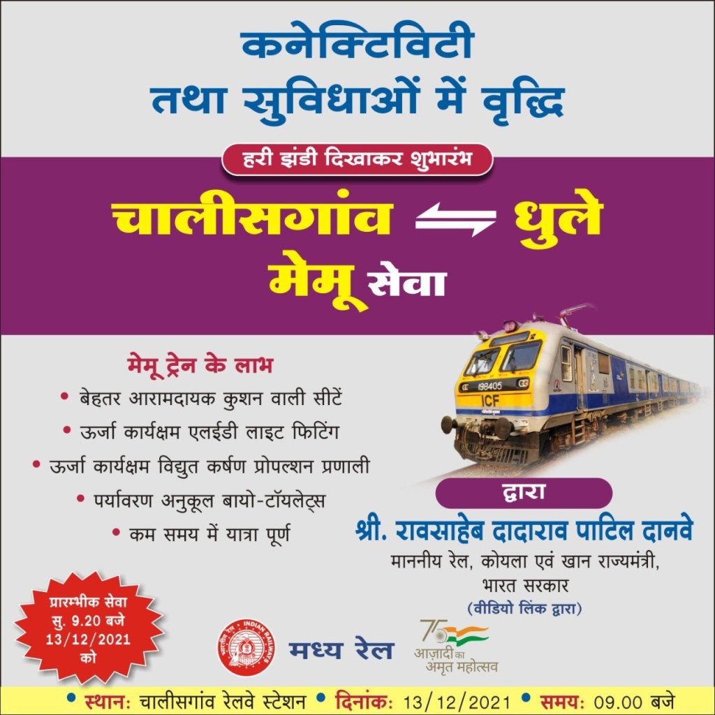 उद्धाटन प्रसंगपर सम्बोधन में रेल राज्यमंत्री रावसाहेब दानवे पाटील ने संक्रमणकाल में रेल कर्मियों के अथक प्रयासों की सराहना की। इतने गम्भीर संकट के दौरान भी मालगाड़ियोंके जरिए रेल कर्मचारी देश सेवा में निरन्तर डटे रहे। रेल सेवा यह सड़क परिवहन के मुकाबले कई अधिक किफायती है। जहाँ चालीसगांव से धुळे के सड़कमार्ग से 80-90 रुपये लगते है, वहीं रेल का यात्री किराया 35 रुपए लगेगा, सिवाय यात्रा भी तेज गति से और आरामदायक होगी।