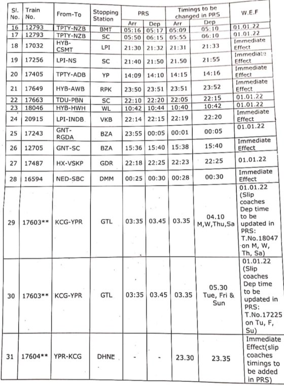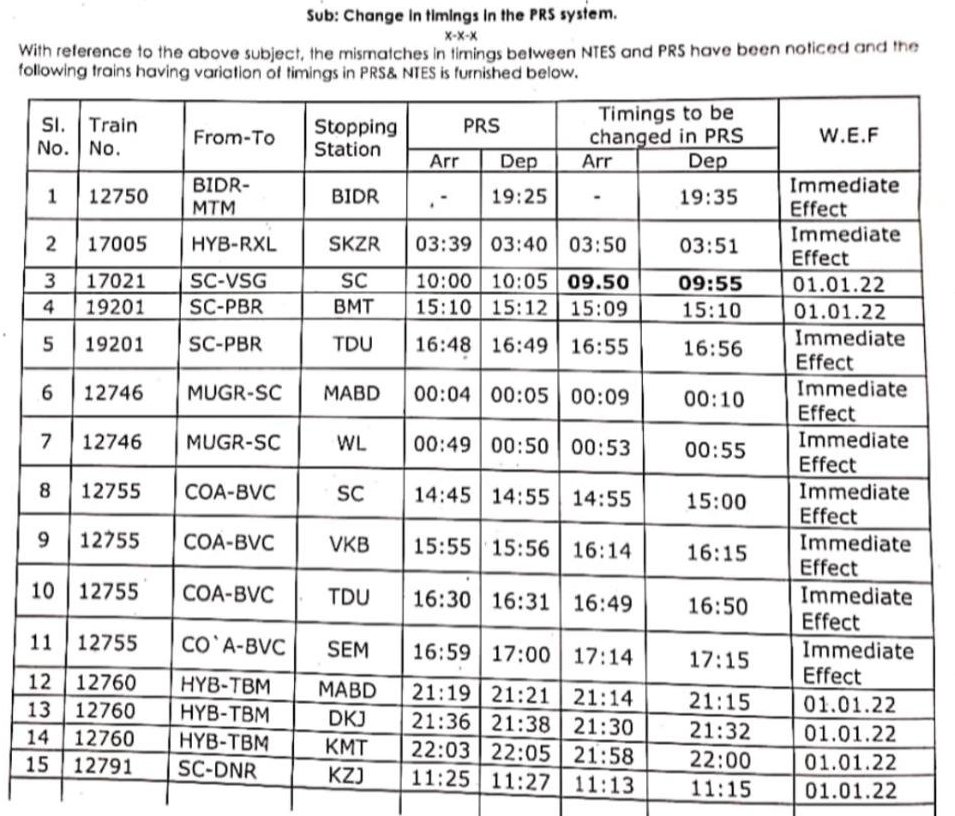 दक्षिण मध्य रेलवे में तकरीबन 31 गाड़ियोंके समयसारणी में भारतीय रेलवे की वेबसाइट/ऍप NTES और भारतीय रेलवे की टिकिटिंग सिस्टम PRS में मतभेद, फर्क पाए गए है। जिससे न सिर्फ यात्रिओंमें बल्कि रेल के परिचालन में भी दिक्कतें आती है। द म रेल ने ऐसे सारे मतभेद को दिनांक 01 जनवरी 2022 तक PRS में सुधार करने के लिए परिपत्रक जारी किया है। यात्रीगण कृपया निम्नलिखित परिपत्रक देखे, इन मे से कई सुधार तुरन्त प्रभाव से भी किए जा रहे है।